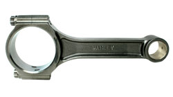 Manley Sportsmaster connecting rods are forged from aircraft quality 4340 material. Each rod has the entire beam and cap area profiled to remove stress risers and render the lightest possible rod. After machining, rods are shot peened and magnafluxed. Bores are round and without taper. Bend and twist is tightly controlled. |